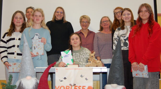 Das Bild zeigt die Teilnehmerinnen des diesjährigen Vorlesewettbewerbes mit der Jury und Organisatorin Silke Loogen-Leifhelm.